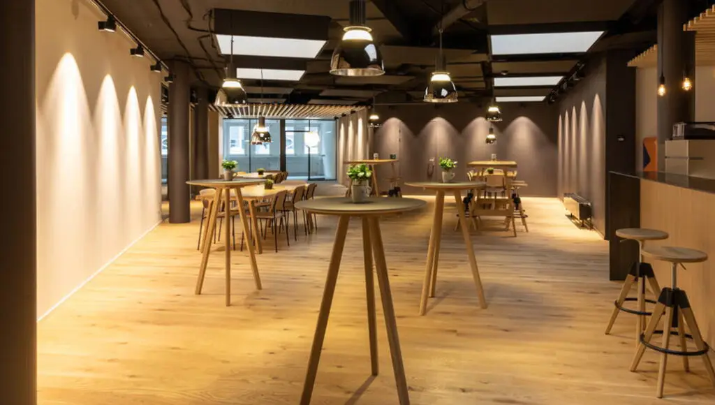 Einrichtung Caféteria: Hohe Stehtische aus Holz: Montis Runde Stehtischle & Stühle: HAY Barhocker: Pedrali Sofa: Arper