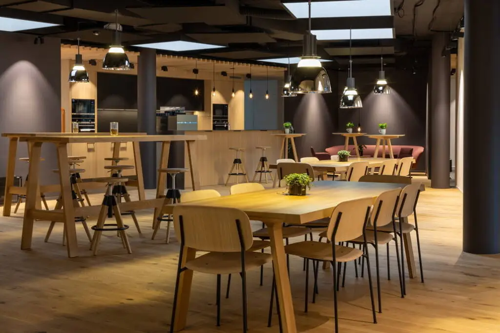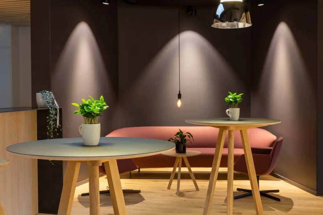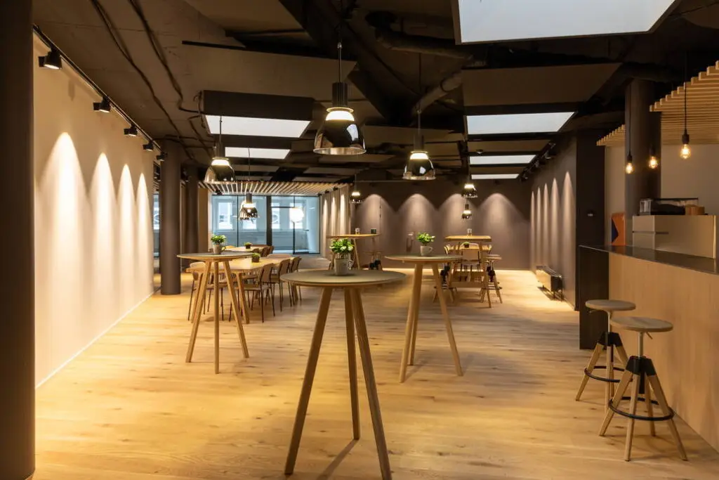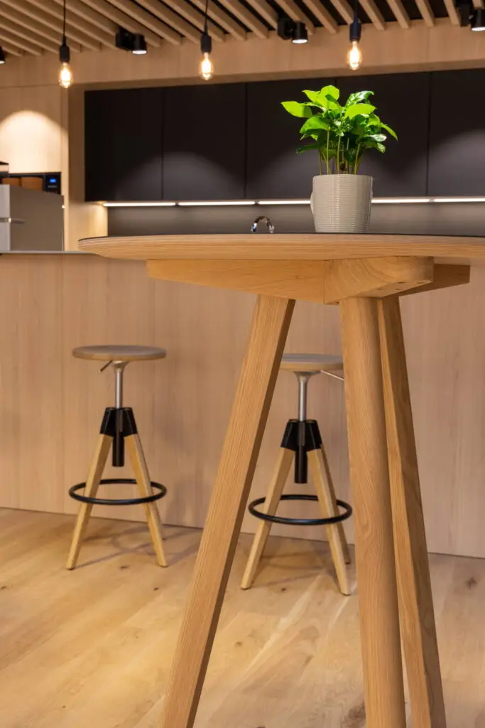 Einrichtung Caféteria: Hohe Stehtische aus Holz: Montis Runde Stehtischle & Stühle: HAY Barhocker: Pedrali Sofa: Arper